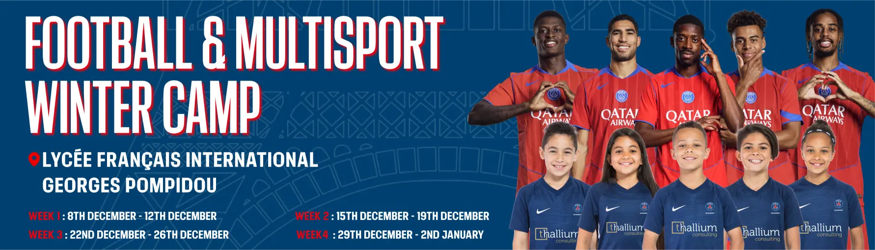 Our PSG Academy Mid-Term Camp at the Lycée Français International Georges Pompidou (LFIGP) offers a dynamic mix of football and multisport activities, led by our PSG-certified coaching team.